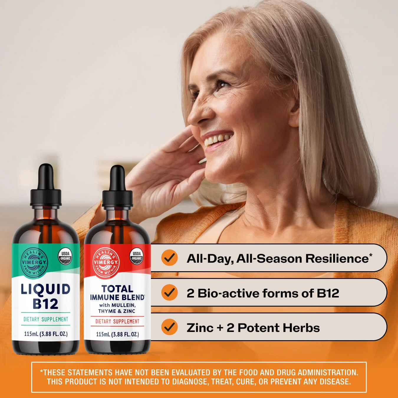 The VIMERGY All-Day Resilience Kit boosts all-day, all-season brain and body resilience with a complementary blend of B12, Zinc, Mullein & Thyme. Naturally delicious and easy to mix with fruits & smoothies or take directly from the dropper. *